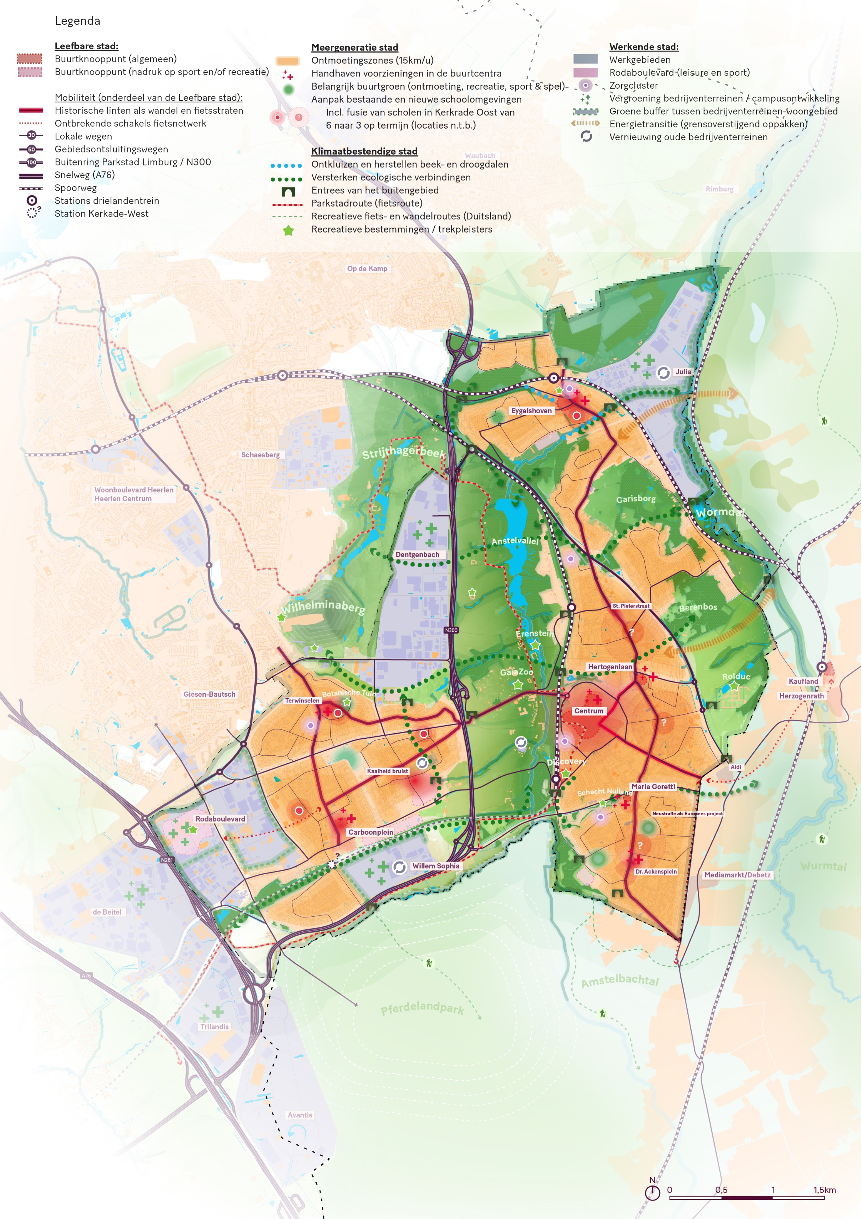 Op de visiekaart is het totaal aan ruimtelijke aandachtspunten en veranderingen voor Kerkrade te zien.