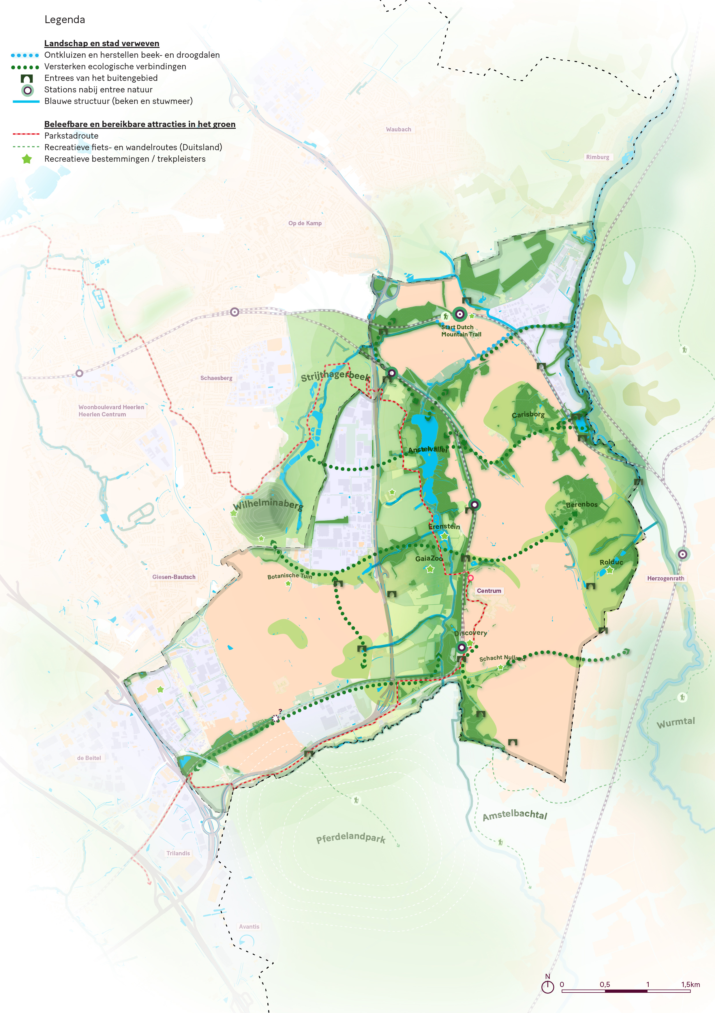 Op enkele plekken is er aanleiding om wel grotere structuren te verbinden. Soms om de kwaliteit van de plek te verbeteren soms om het landschap eromheen te versterken. Dit soort plekken zijn bijvoorbeeld in Eygelshoven waar kansen liggen voor het weghalen van de overkluizing van de Anselderbeek of het Doctor Ackensplein in Bleijerheide waar een oud droogdal en een kerkenpad toegang geeft tot het buitengebied.