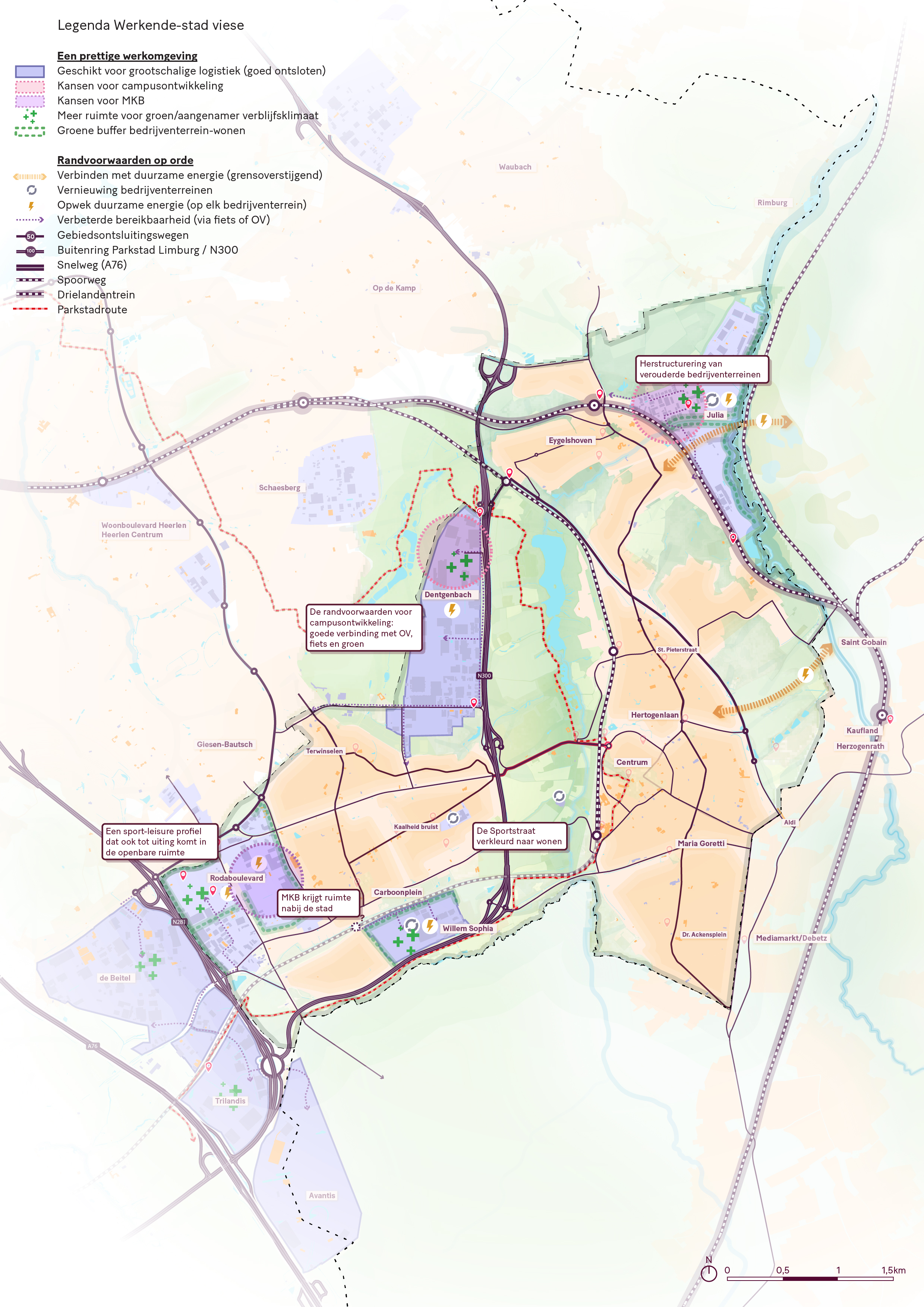 kleinbedrijf (MKB), de grootschalige bedrijvigheid een plek heeft. Sommige van deze bedrijventerreinen liggen tussen het stedelijk gebied en het landschappelijk raamwerk (buitengebied), vaak op voormalige mijnterreinen. Anderen liggen goed gepositioneerd langs (snel)wegen zoals de Buitenring Parkstad (N300) en de A76 die de regio Parkstad en Kerkrade Eurogionaal verbinden. Het maakt de regio aantrekkelijk voor bedrijven met een internationale afzetmarkt, zoals de logistiek en de MedTech sector. Het aantal arbeidsplaatsen is de afgelopen jaren dan ook flink toegenomen.