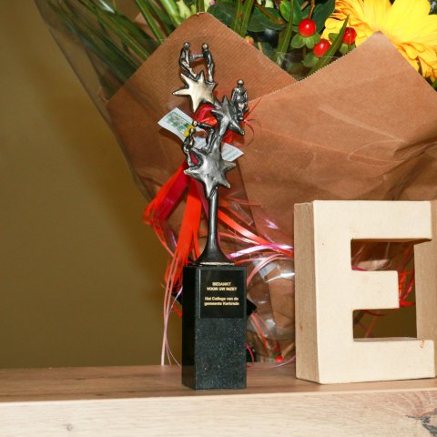 Vrijwilligers Ontmoetingswinkel Ennúh Rolduckerveld ontvangen Sterrenteam-beeldje
